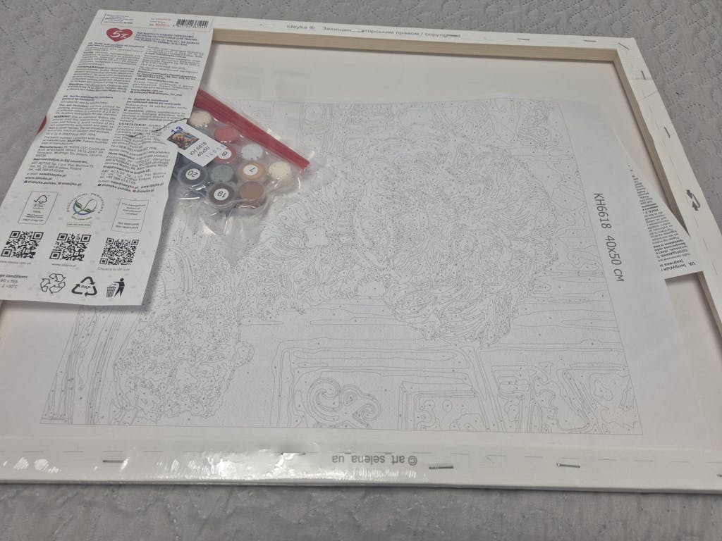 Komplektą sudaro: numeruota ir įrėminta natūrali drobė 40x50, nailoniniai teptukai (3 dydžių), numeruoti akriliniai dažai, kontrolinis lapas (popierinis arba su QR kodu).